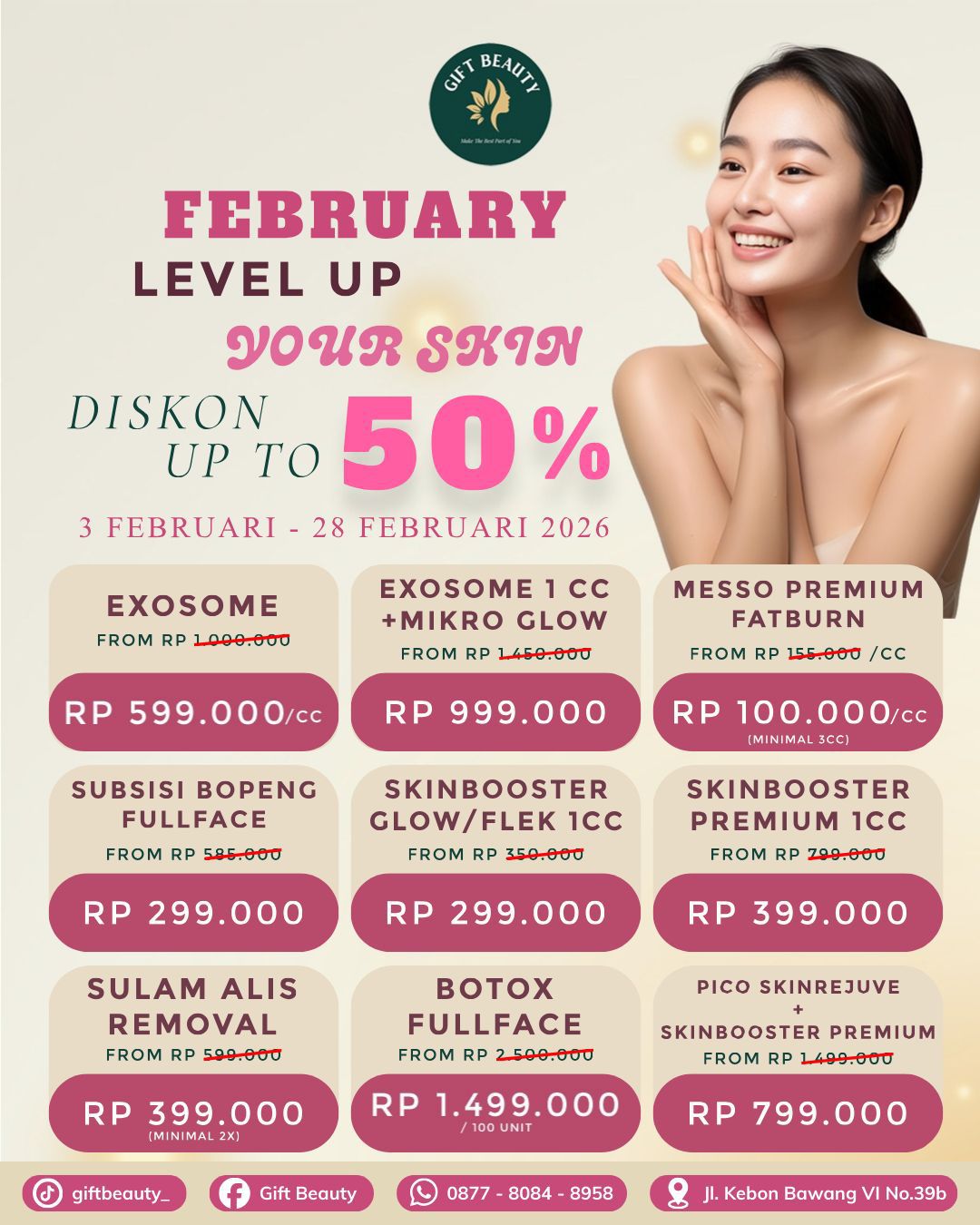 Bulan Februari adalah waktu yang tepat untuk upgrade perawatan kulitmu. Melalui program February Level Up Your Skin, Gift Beauty menghadirkan promo spesial dengan diskon hingga 50% untuk berbagai treatment unggulan. Promo ini berlaku mulai 3–28 Februari 2026, khusus untuk kamu yang ingin hasil kulit lebih sehat, glowing, dan terawat maksimal.